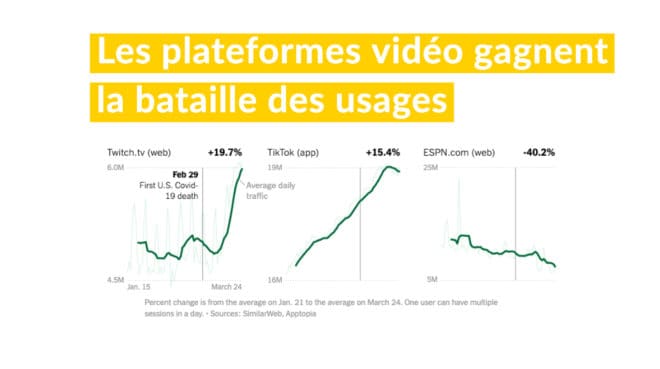 Une analyse du New York Times sur l’utilisation d’Internet aux États-Unis par SimilarWeb et Apptopia, deux fournisseurs de données en ligne, révèle que les comportements ont changé, parfois de manière frappante, à mesure que le virus se propageait et poussait les gens vers les appareils pour travailler, jouer et se connecter. Même si l’analyse se concentre sur les USA, les répercussions du confinement sont assez similaires partout dans le monde !