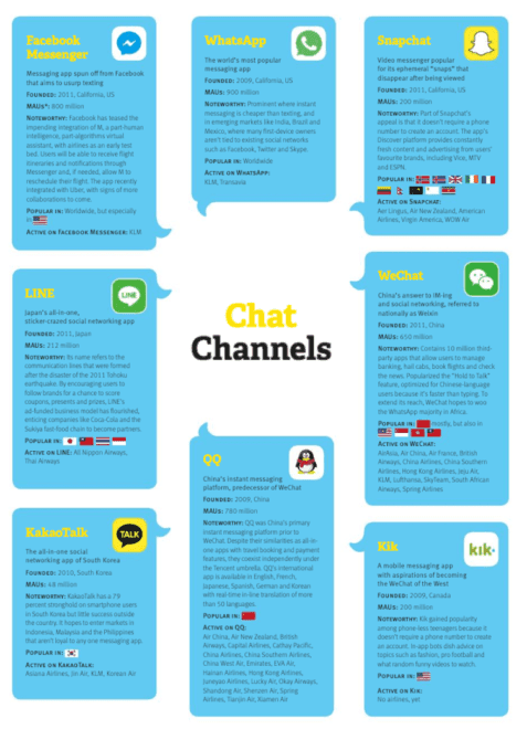 La messagerie a ajouté la possibilité de faire des réservations de vols sur son application mobile. Avec 355 millions d’utilisateurs actifs, WeChat est en train de devenir une plate-forme de transaction de voyage. Beaucoup de compagnie aérienne sont présente sur la messagerie.