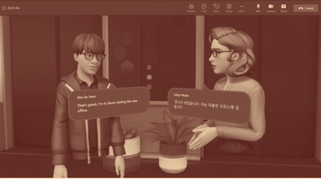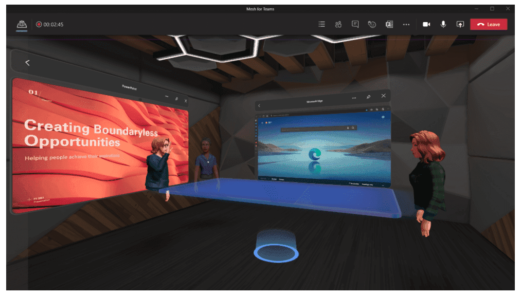La fonctionnalité combine les capacités de réalité mixte de Microsoft Mesh, qui permet aux personnes situées dans différents emplacements physiques de rejoindre des expériences holographiques collaboratives et partagées, avec les outils de productivité de Microsoft Teams, où les personnes peuvent rejoindre des réunions virtuelles, envoyer des chats, collaborer sur des documents partagés et Suite. Accenture a utilisé un logiciel Microsoft pour créer un « jumeau numérique » de son siège social afin d’organiser des orientations pour les nouveaux employés pendant la pandémie. Le cabinet de conseil a organisé plus de 100 événements de ce type, touchant plus de 10 000 employés.