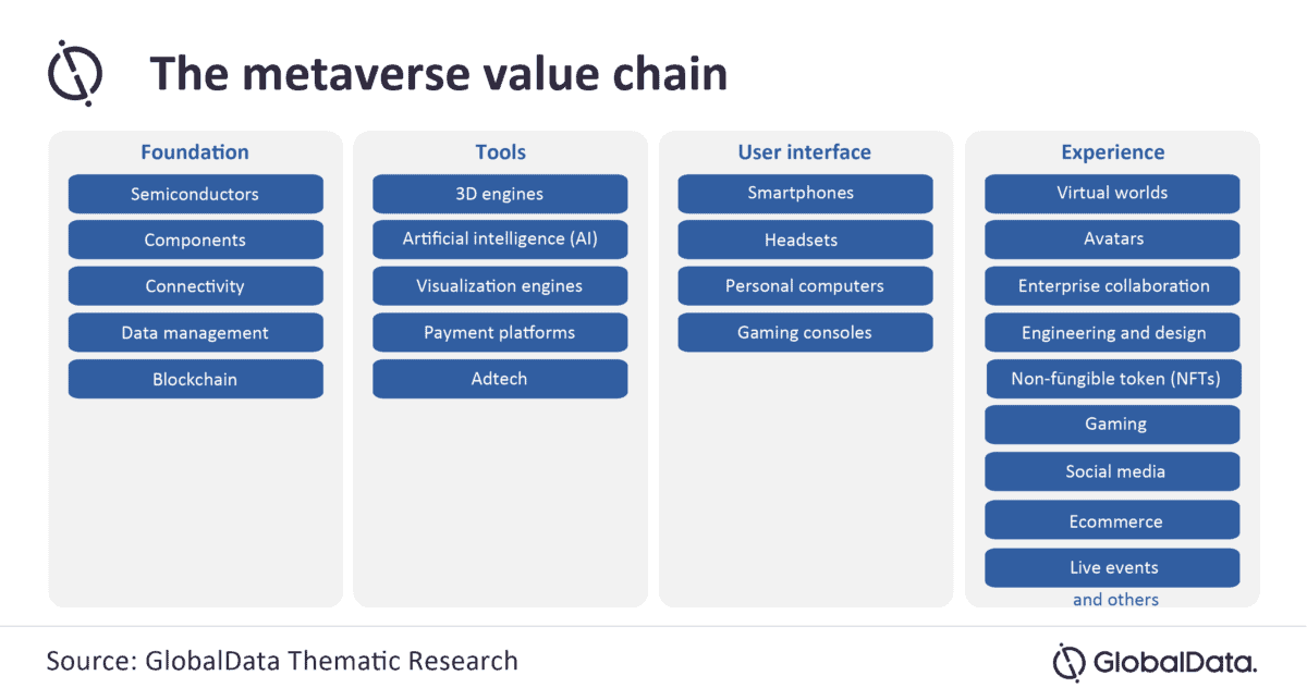 En l’absence de définition standard pour le moment, le métavers signifie différentes choses pour différentes personnes en fonction de la nature de leur entreprise. Cela signifie que la plupart des entreprises peuvent faire en sorte qu’il soit ce qu’elles veulent qu’il soit. Pour démontrer les nombreuses couches et aspects du métavers, le rapport de GlobalData présente une chaîne de valeur thématique, divisant les composants en quatre catégories : fondation, outils, interface utilisateur et expérience.