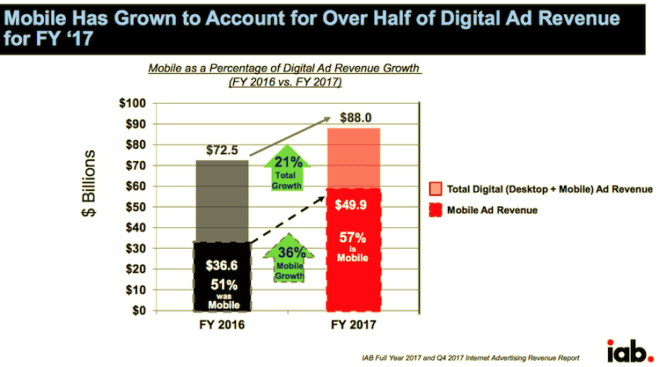 La publicité numérique a connu une autre année record en 2017, les revenus publicitaires US s’élevant à 88 milliards de dollars, en hausse de 21% par rapport à 2016, a annoncé l’IAB dans un rapport préparé par PwC. Comme prévu, le mobile a capturé la majorité de ces dollars, soit 57%, environ 50 milliards de dollars, contre 36,6 milliards de dollars en 2016.