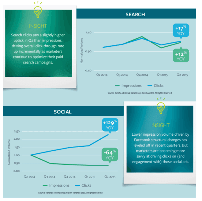 L’infographie ci-dessous propose les indicateurs clés du référencement payant et de la publicité sur les réseaux sociaux, à partir de l’étude de 550 milliards d’impressions, 9,5 milliards de clics et 5.5 milliards (USD) de dépenses gérés via Kenshoo.