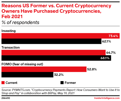 Alors que les principales raisons de posséder des crypto-monnaies aux États-Unis sont les investissements et les transactions, plus de 50 % des adultes américains qui possèdent des cryptos achètent également des devises numériques comme le Bitcoin parce qu’ils ne veulent pas avoir l’impression de manquer quelque chose.