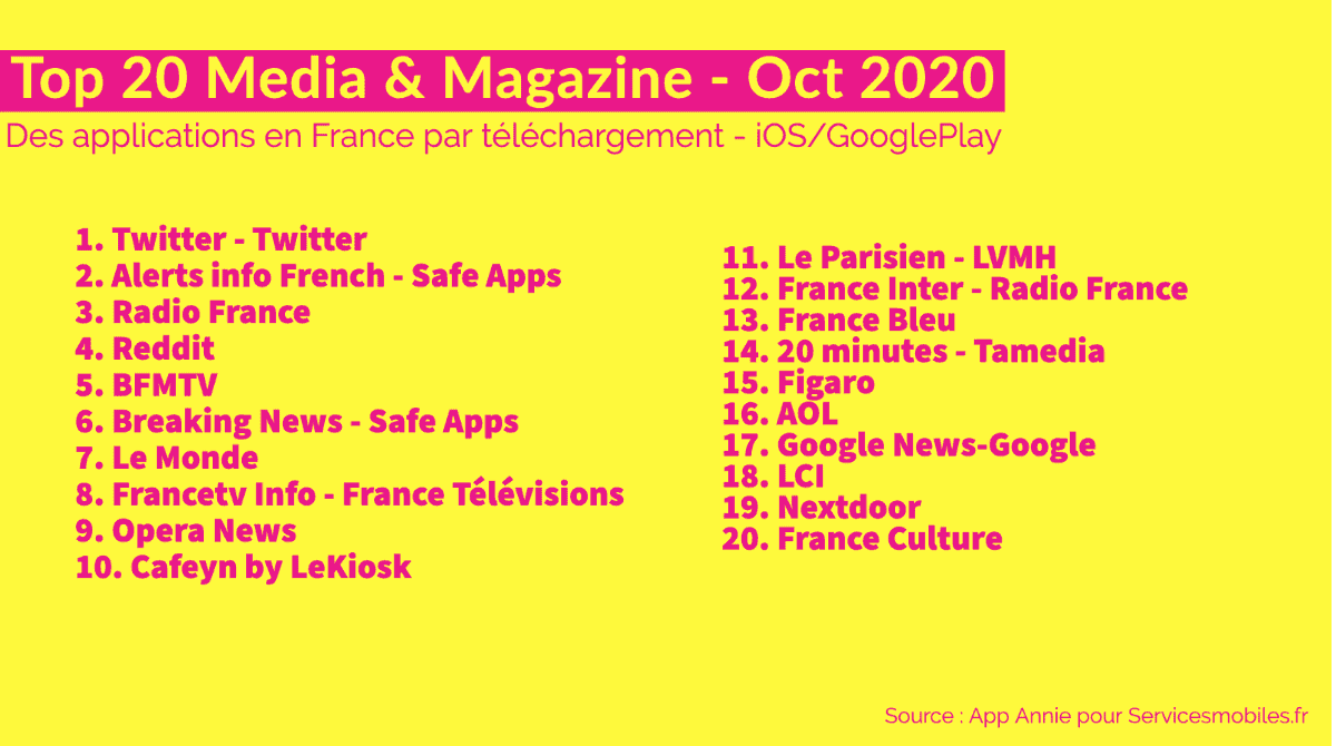 Impressionnant d’avoir 2 applications de Safe Apps dans le top 10, un éditeur fantôme ! BFMTV remonte avec les élections US dans le top 5. Excellente performance de la stratégie digitale depuis des années de Radio France (4 apps dans le top 20), des applications bien conçues qui rencontrent leur public. Radio France représente aujourd’hui la première entreprise culturelle de France. Avec 7 radios qui cumulent plus de 15 millions d’auditeurs quotidiens, cela en fait une référence en matière d’information grâce à la richesse de ses programmes.