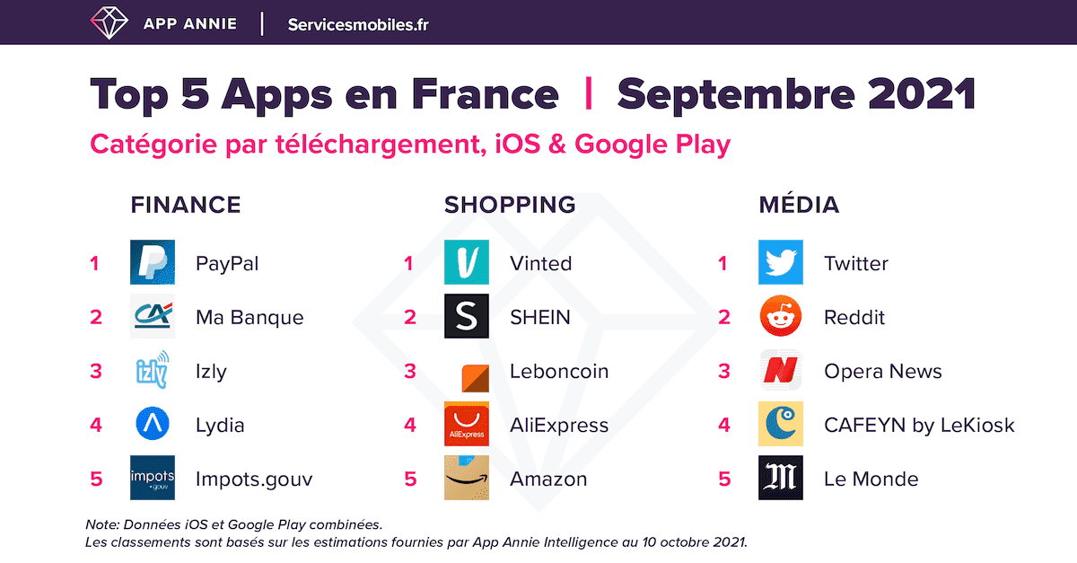 Le Top 5 des Apps en France (Septembre 2021) : Finance, Media, Shopping