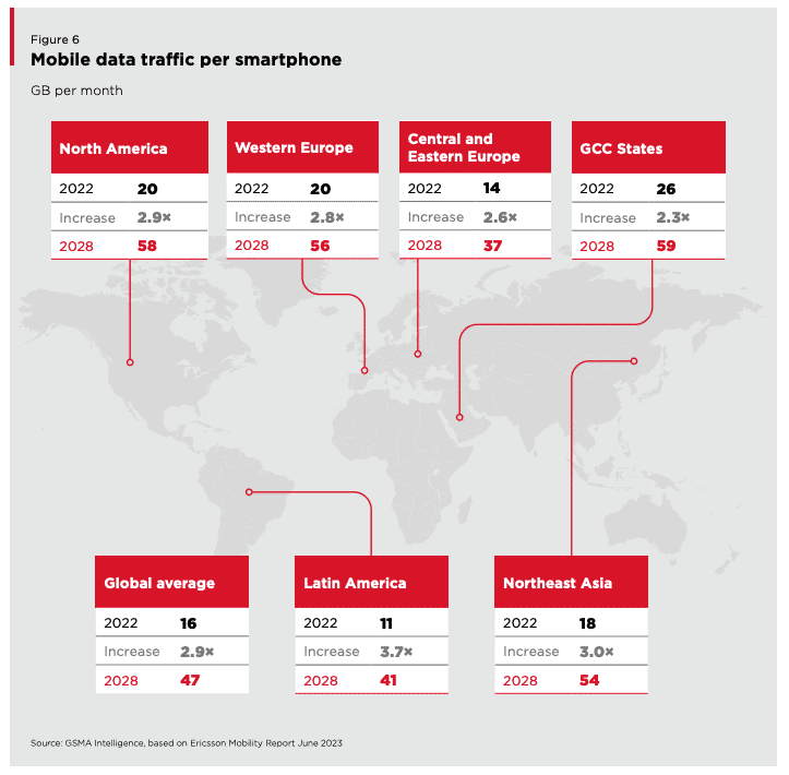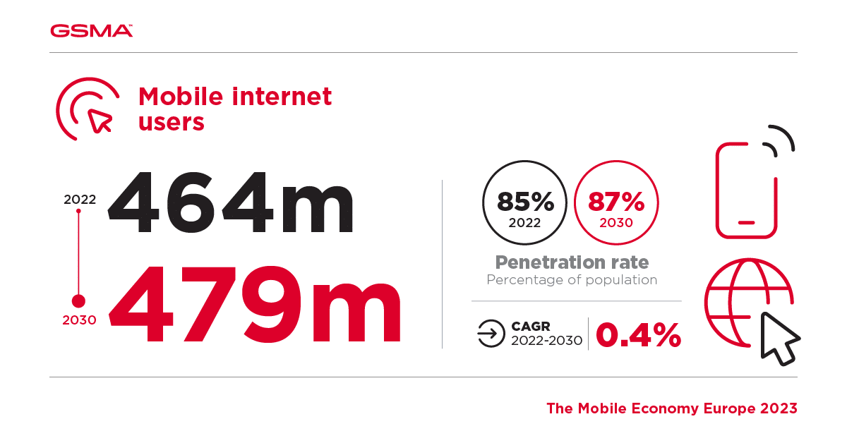 Avec une croissance de 11 millions d’abonnés entre 2022 et 2030, l’Europe atteindra 507 millions d’ici 2030. La pénétration unique des abonnés mobiles en Europe atteindra 92 % de la population d’ici 2030, plus élevé que l’Amérique du Nord et bien plus élevé que le moyenne mondiale (à 73 %). En Europe, la pénétration les taux sont supérieurs à 90 % dans la plupart des pays, la France atteignant 96 %, l’Allemagne 94 % et le Royaume-Uni 93 % d’ici 2030.