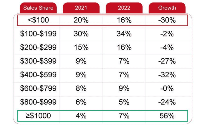 Ci-dessous, un graphique montre les chiffres entre janvier et octobre 2021 vs 2022 des parts des ventes US par segment de prix et croissance des volumes.