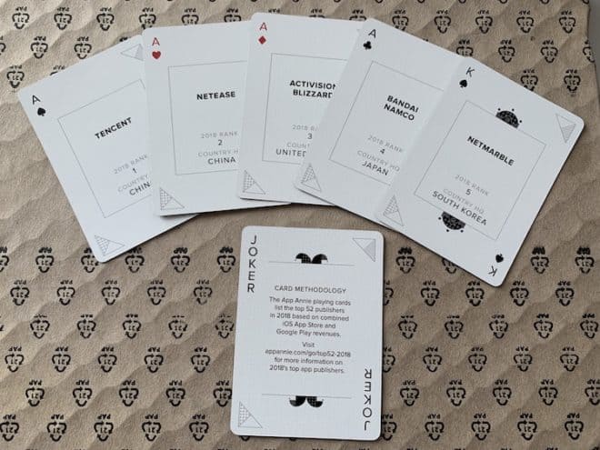 Comme il est de tradition chez App Annie, ils ont à chaque éditeur attribué une carte à jouer, créant ainsi un jeu de cartes personnalisé comprenant les gagnants, formant le Top 52 des éditeurs du monde entier sur les magasins iOS et Google Play qui ont le plus générés de revenus par les consommateurs combinés iOS et Google Play du 1er janvier 2018 au 31 décembre 2018 inclus. Il y a généralement peu de changements dans les 10 premiers éditeurs chaque année. La Chinoise Tencent a pris la première place pour une troisième année consécutive impressionnante; NetEase (Chine) a conservé sa place en 2e place; Activision Blizzard (États-Unis) a grimpé d’une place à la troisième place; Bandai Namco, du Japon, s’est classé pour la première fois dans le top cinq, passant de la troisième place à la quatrième place; et Netmarble, puissance sud-coréenne, a terminé au 5e rang des meilleures entreprises. Le seul nouvel ajout au top 10 en 2018 est Playrix, qui a grimpé de deux places à la 9e place.