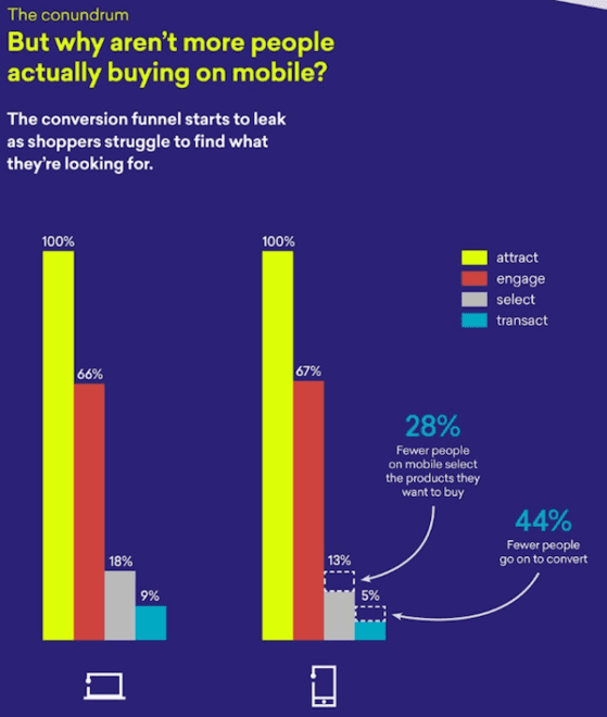 Sur un appareil mobile, les personnes participant à l’enquête affirment que la découverte de produits médiocres constitue le principal obstacle à leur expérience d’achat sur mobile. Et au fur et à mesure que les consommateurs font leurs achats, les transactions sur mobile connaissent une baisse spectaculaire. En fait, les résultats de l’étude suggèrent que les clients sont plus engagés sur le mobile que sur les ordinateurs de bureau pendant qu’ils recherchent des produits – mais plus ils prennent de temps, plus ils risquent de tomber et d’abandonner la vente. Cela suggère que les clients peuvent trouver des produits sur mobile, mais ils ne trouvent pas ce qu’ils veulent.