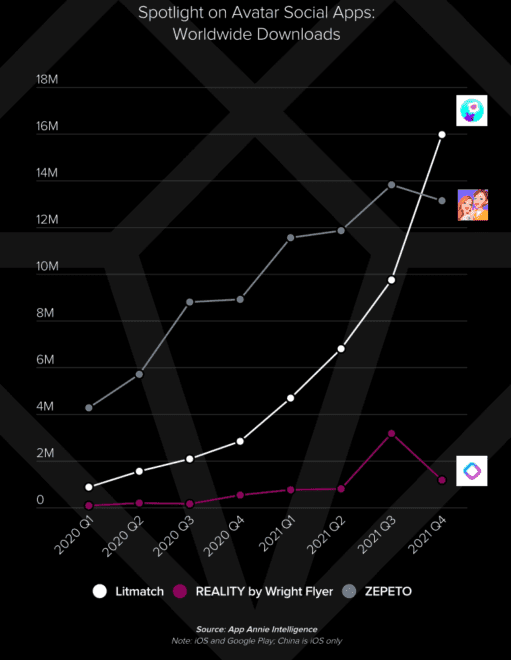 Parmi les 3 applications sociales d’avatar sélectionnées dans le rapport State of Mobile 2022, Litmatch, Reality by Wright Flyer et Zepeto, les téléchargements ont augmenté de 160 % en glissement annuel. Litmatch met l’accent sur la correspondance avec des amis et l’utilisation d’un simple avatar, soulignant le chevauchement de la demande croissante d’applications basées sur des avatars, même sans composant de métavers, 2 tendances convergentes.
