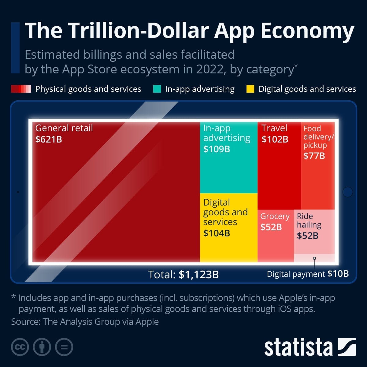 Selon une étude commandée par Apple, les utilisateurs ont téléchargé des applications plus de 370 milliards de fois au cours des 15 dernières années, tandis que les développeurs ont gagné plus de $ 320 milliards sur l’App Store depuis son lancement. Compte tenu de tout ce que les gens achètent, réservent ou commandent via des applications de nos jours, l’économie de l’App Store est encore plus grande que cela. Selon le groupe d’analyse, l’App Store d’Apple a facilité plus de $ 1,1 billion de factures et de ventes l’année dernière, doublant plus que 2019, lorsque le total était estimé à $ 519 milliards.
