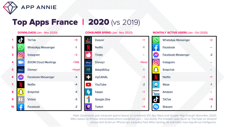 • En France, TikTok prend également la tête des applications les plus téléchargées en 2020.