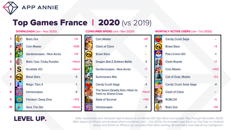 En France, ce sont les jeux casual qui se classent parmi les premiers avec Brain Out, Coin Master et Candy Crush.