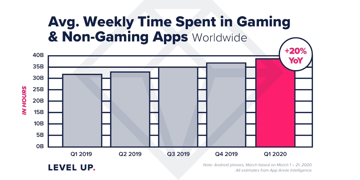 Le temps passé quotidien sur mobile a augmenté dans le monde entier à mesure que l’épidémie s’est étendue au premier trimestre 2020. En Chine, le premier pays à faire face à l’impact du coronavirus, le temps passé quotidien a augmenté de 30 % pour atteindre 5 heures par jour en moyenne. L’Italie, le deuxième marché le plus touché, a connu la deuxième hausse la plus importante, soit 11 %. Au niveau mondial, le temps hebdomadaire moyen consacré aux applications et aux jeux sur les téléphones Android a augmenté de 20 % par rapport au premier trimestre 2020.