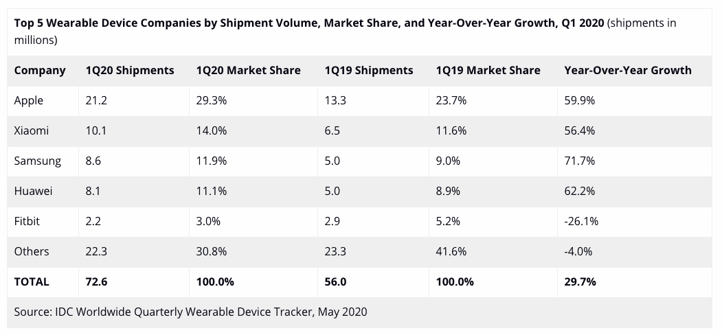 Alimentée par les lancements de nouveaux produits tels que le Fitbit Charge 4 ainsi que par les prix agressifs des piliers comme Xiaomi et Huawei, la catégorie des bracelets a augmenté de 16,2% au cours du trimestre.