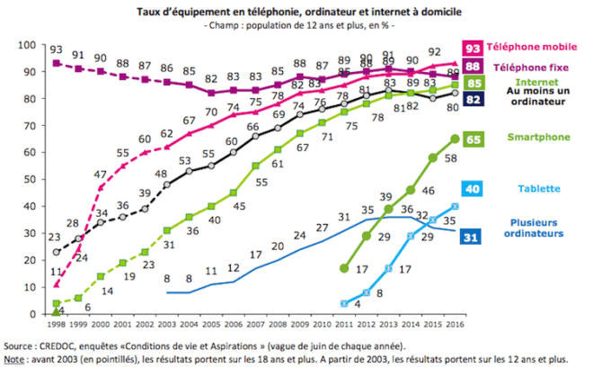 L’Arcep, le Conseil général de l’économie (CGE) et l’Agence du Numérique ont publié les résultats de leur enquête annuelle (244p – superbe Data en open source pour les startup…) sur la diffusion des technologies de l’information et de la communication en France, l’un des enseignement principaux sans surprise : Le téléphone mobile, désormais équipement de référence en France