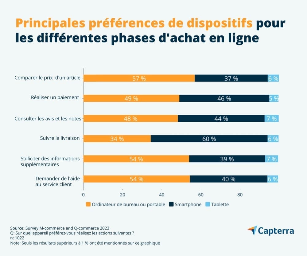 Alors que les tablettes (11 %) restent utilisées à une fréquence moindre, les smartphones représentent à eux seuls 38 % des dispositifs mobiles sélectionnés par nos participants. Les montres connectées (4 %), dont certains modèles permettent de régler des achats à l’intérieur d’applications, restent des supports peu employés pour le m-commerce. Dans certains cas, le recours aux smartphones s’avère même très proche, voire supérieur à celui des ordinateurs. Ainsi, 46 % de la totalité des participants disent faire usage de leur smartphone au moment de finaliser un paiement contre 49 % préférant un ordinateur ; 60 % privilégient leur mobile pour suivre la livraison d’un produit quand 34 % optent pour un ordinateur.