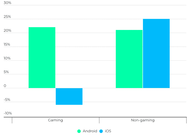 - La baisse de 6 % du nombre de jeux mobiles sur iOS en est la meilleure illustration, alors qu’Android a connu une croissance significative de 22 %.