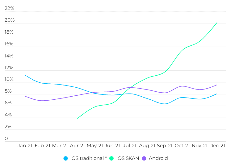 Hardcore iOS : 31 % - Les installations iOS non organiques ont chuté entre avril et septembre 2021 à la suite de la mise en place du ATT d’Apple, mais ont montré des signes de reprise vers la fin de l’année 2021.