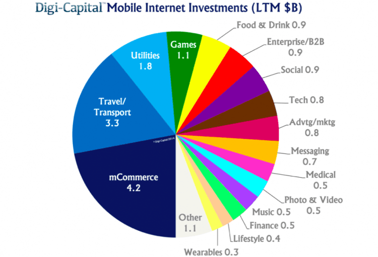 Les entreprises de l’Internet mobile ont récolté un total de 19,2 milliards de dollars en nouveaux investissements au cours de la dernière année, plus du double de la période précédente, selon le cabinet de conseil en investissement Digi-Capital. Le Top 3 des investissements le mCommerce (4,2 milliard de dollars), Voyage / Transport (3,3 milliard de dollars), les services publics (1,8 milliards de dollars), et lees jeux (1,1 milliards de dollars)