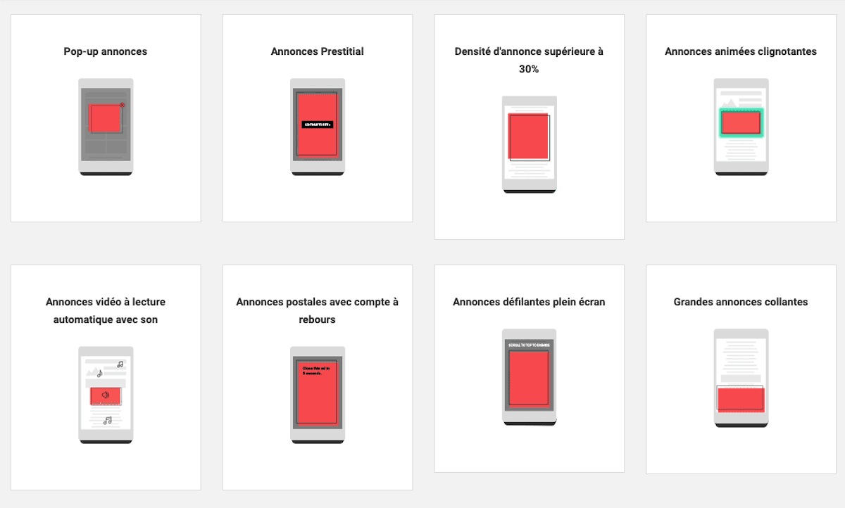 Suivez la norme Better Ads lorsque vous affichez des annonces sur des appareils mobiles. Par exemple, les annonces en haut de la page peuvent occuper trop de place sur un appareil mobile, ce qui est une mauvaise expérience utilisateur.