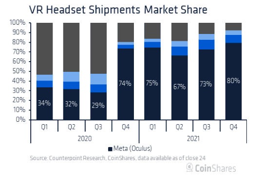 Meta a une portée mondiale de 1,93 milliard d’actifs quotidiens d’utilisateurs et un total de 2,6 milliards d’utilisateurs. Les grands canaux de distribution et des économies d’échelle pourraient se traduire par des produits à faible coût et un plus grand marché auquel vendre. Meta a atteint 80 % de part de marché des casques de réalité virtuelle (VR) en 2021.