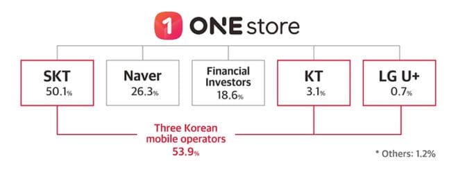 One Store a été créé en 2016 en intégrant les marchés d’applications mobiles de SKT, KT et LG Uplus et Naver. Dans le cadre d’un partenariat, les trois opérateurs de téléphonie mobile offrent une réduction d’adhésion de 10 % à leurs abonnés pour aller sur le store d’application pour les smartphones Android et autres appareils mobiles. Le store peut être utilisé sur les téléphones et tablettes Android en Corée. Il fournit des jeux, des applications, du commerce mobiles, des livres électroniques et du contenu vidéo à 35 millions de membres.