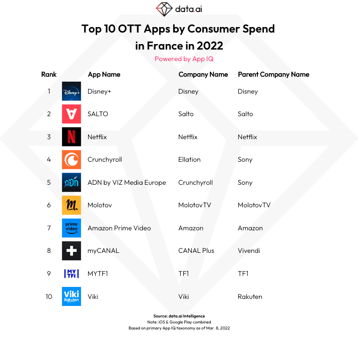 En France, les consommateurs passent du temps sur Disney+ et sur Salto.