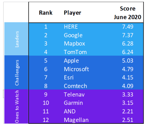 L’écart se resserre entre Microsoft et Apple. Ces deux vendeurs sont des Challengers et traversent une période de transition qui ne s’est toujours pas terminée. Apple a publié la mise à jour tant attendue d’Apple Maps aux États-Unis, mais ce n’est pas une refonte spectaculaire qui n’a pas encore suffi à modifier sa position. Les efforts de Microsoft, en particulier avec la proposition cloud Azure Maps optimisées pour l’entreprise, a aidé augmenter son score et a comblé l’écart sur Apple.