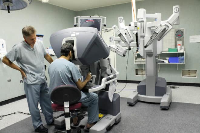 Les robots peuvent également participer à des tâches plus complexes, telles que la chirurgie. Leur participation peut aller de la simple stabilisation des outils du chirurgien à la réalisation autonome de l’ensemble de l’opération. Le système de chirurgie robotique le plus connu permet à un chirurgien de faire fonctionner un équipement de taille standard et ergonomique, comme télécommande, afin de diriger des instruments extrêmement minuscules dans le corps d’un patient, souvent au travers de très petites incisions .
