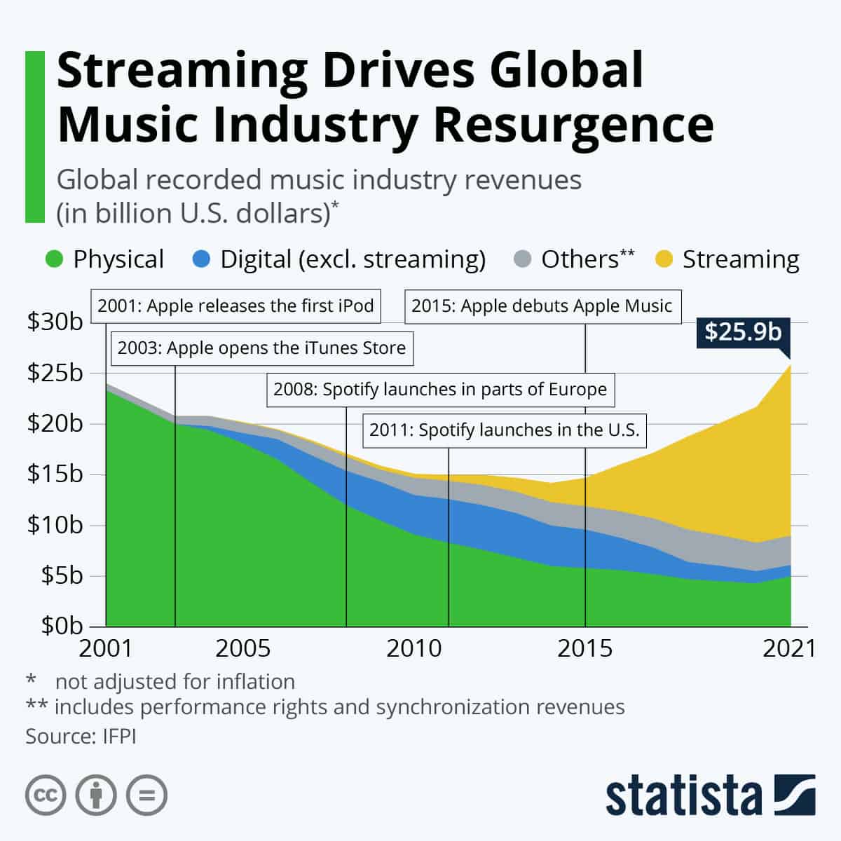 Selon les données publiées par l’IFPI, l’industrie de la musique a atteint un creux en 2014, lorsque les revenus étaient au plus bas en 20 ans à 14,2 milliards de dollars, soit près de 10 milliards de dollars de moins qu’il y a 15 ans, lorsque les ventes de musique physique à elles seules s’élevaient à 24 milliards de dollars au plus fort de l’ère du CD. Après une certaine hésitation initiale de l’industrie de la musique à adopter les services de streaming, les maisons de disques et les artistes semblent avoir suivi l’exemple des consommateurs en acceptant que l’avenir de la musique réside dans la distribution numérique.