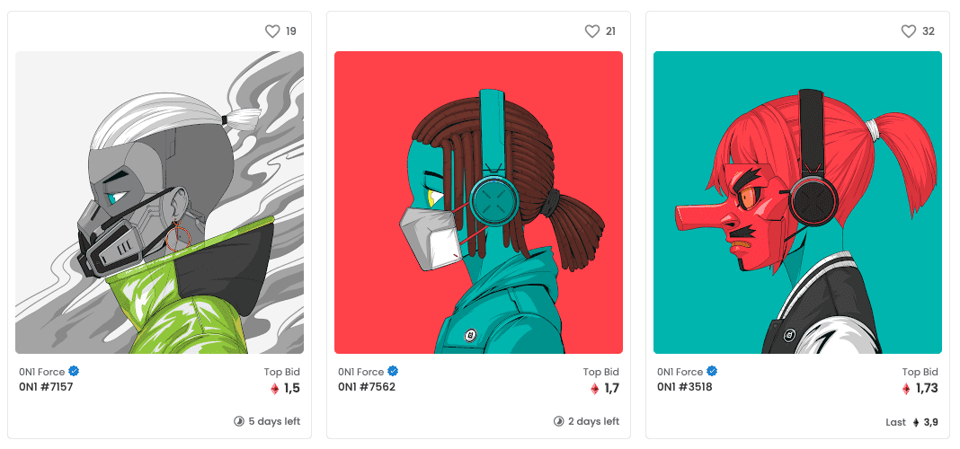 La collection 0N1 Force est composée de 7 777 personnages génératifs avec plus de 100 caractéristiques dessinées à la main luttant pour leur existence. En plus des illustrations, chaque NFT donne accès à un jeu de rôle collaboratif (RPG) qui emmène les joueurs dans le 0N1verse.