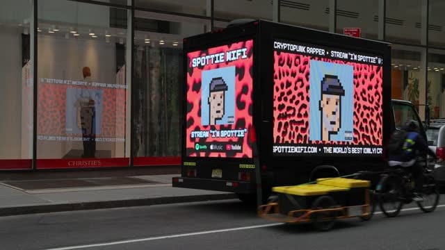 NEW YORK, NEW YORK – MAY 11: A truck parked outside of Christie’s auction house displays a CryptoPunk digital art non-fungible token (NFT) on electronic billboards on May 11, 2021 in New York City. Christie’s is auctioning nine of Larva Labs’ CryptoPunks NFTs during its 21st Century Evening Sale. (Footage by Dia Dipasupil/Getty Images)