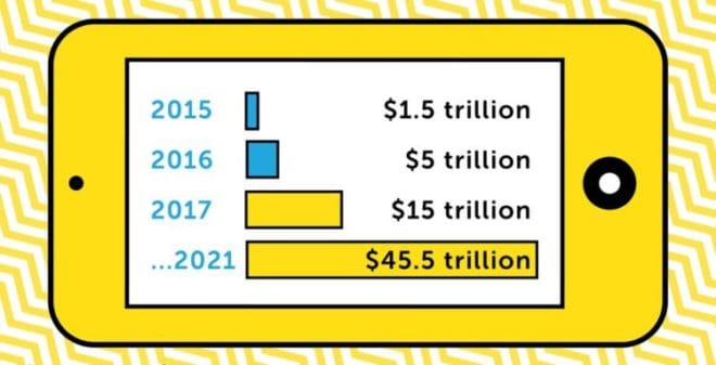 [les achats effectués sur les smartphones et les tablettes représentent 25% des transactions électroniques aux États-Unis et 10 fois celle de la vente dans les magasins physiques – Apple Pay était limitée à environ 3% des magasins aux États-Unis lorsqu’elle a été lancée en 2014, mais elle est maintenant acceptée dans 50% des magasins.]