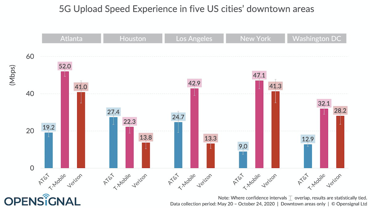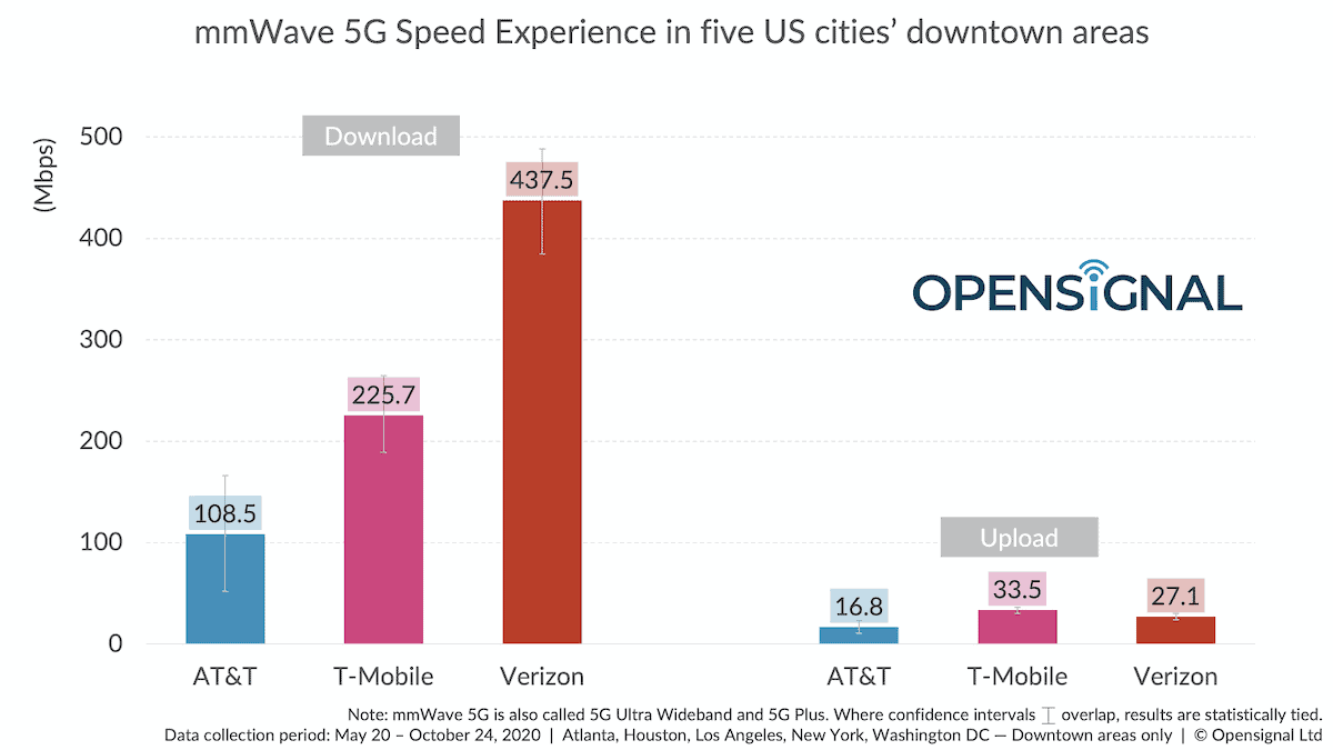 Dans cinq villes US avec l'expérience 5G, il y a des vitesses moyennes mmWave 5G supérieures à 100 Mbps sur les trois opérateurs.