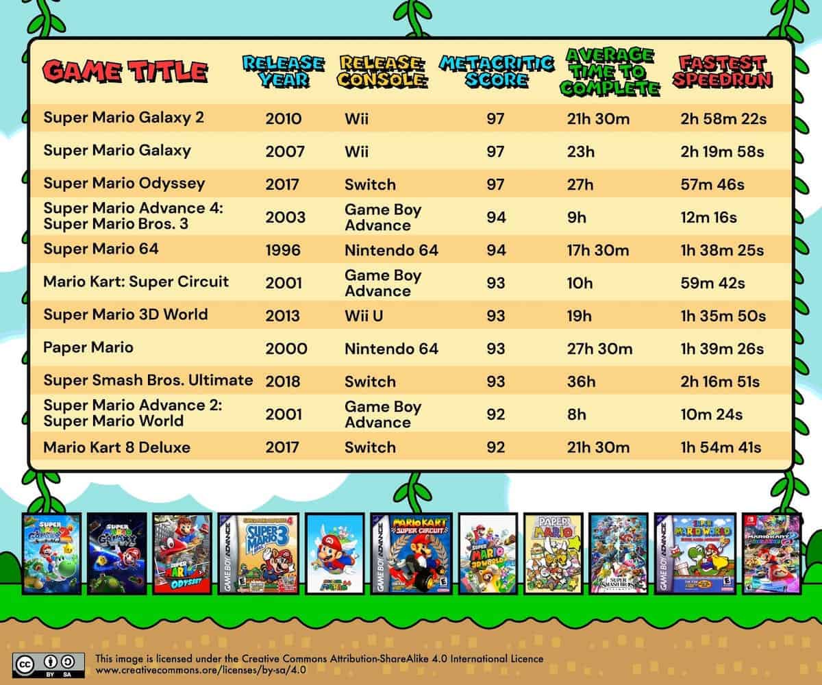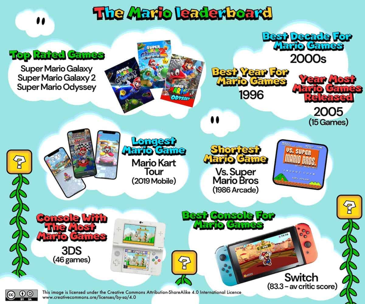 - Saviez-vous que 2005 a été de loin l’année la plus populaire pour les nouvelles sorties de Mario ? 12 jeux Mario ont été lancés sur Game Boy Advance, Gamecube, DS et même un sur borne d’arcade. Et si vous jouiez à chacun des plus de 230 jeux Mario, vous joueriez pendant plus de 2 700 heures – et ce ne sont que ceux dont les délais d’exécution sont indiqués.