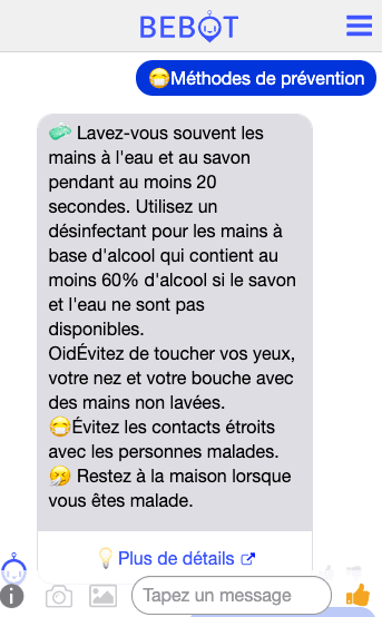 Chatbot basé sur l’IA développée spécifiquement pour les voyageurs, ont lancé «Bebot», qui informe et assiste les résidents et les voyageurs au sujet du nouveau coronavirus 2019. Le chatbot désigné est facilement accessible par n’importe qui. Avec Bebot, les utilisateurs ont un accès immédiat aux informations critiques sur le coronavirus en anglais, chinois simplifié et chinois traditionnel depuis n’importe quel appareil mobile. Il partage des informations sur la santé et les virus, telles que les symptômes à surveiller, les mesures préventives à prendre et les procédures de traitement. Partage les dernières nouvelles sur l’épidémie, les informations statistiques actuelles telles que les taux de transmission et les coordonnées des agences gouvernementales.