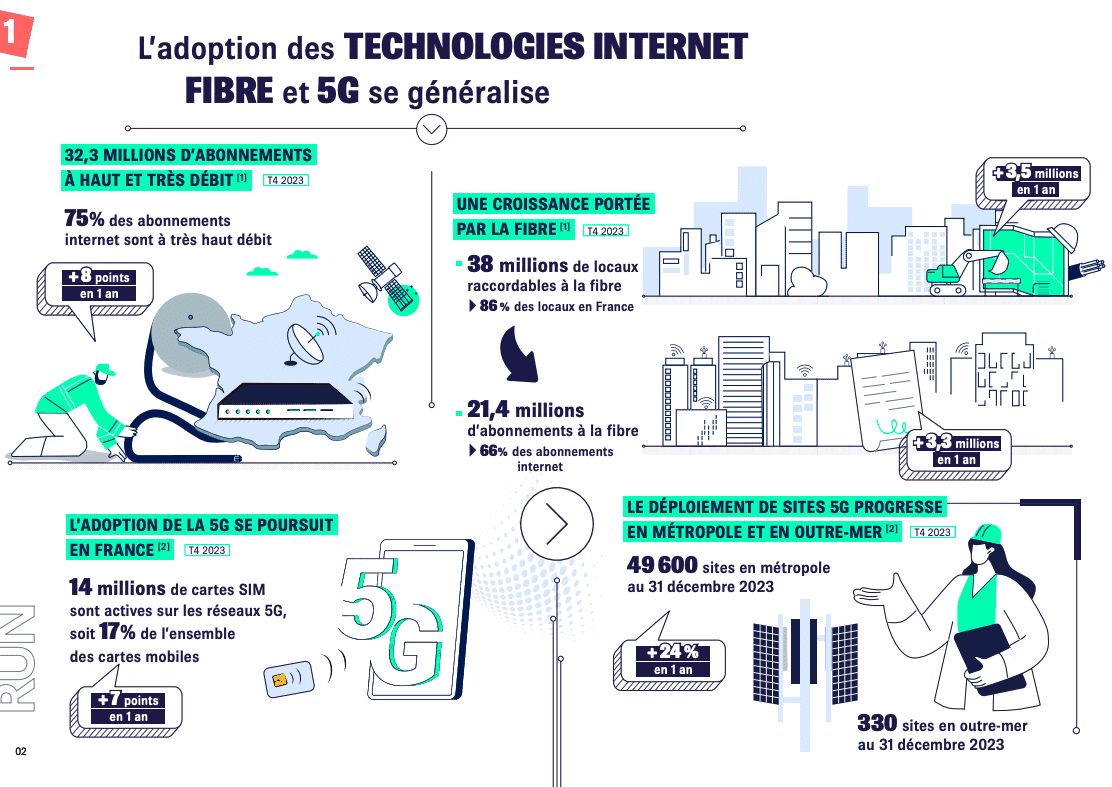 Le dernier référentiel des usages numériques, issu du travail conjoint de l’Arcep et de l’Arcom, révèle une nette progression des déploiements de la fibre optique et de la 5G. Au terme de l’année 2023, près de deux tiers des utilisateurs français d’internet seront abonnés à la fibre optique, soit quelques 21,4 millions d’abonnements. En parallèle, on note une croissance du nombre d’utilisateurs des réseaux 5G qui devrait atteindre 14 millions en fin 2024.