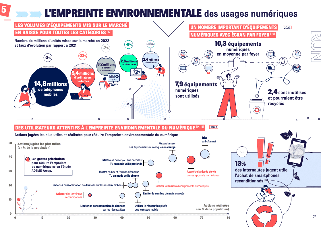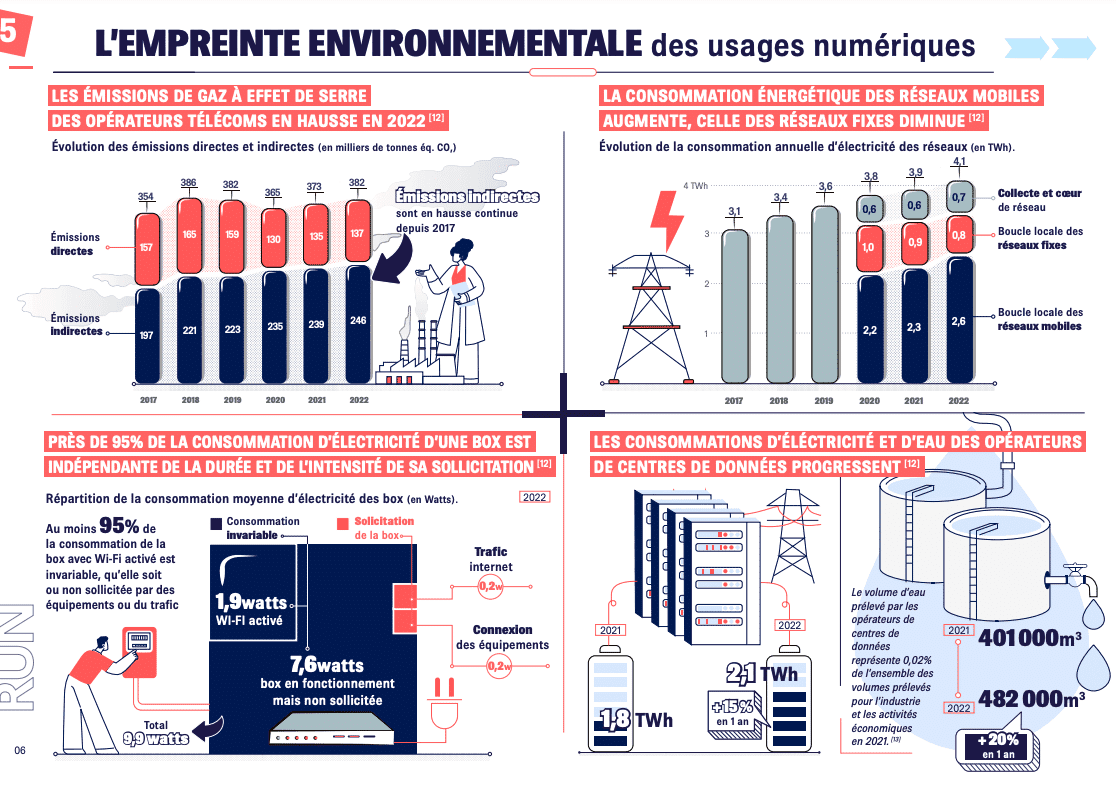 Alors que le nombre de terminaux numériques neufs commence à diminuer, une inquiétude demeure quant à l’empreinte environnementale de ces appareils. « L’impact des grands écrans sur l’environnement ne fait que croître », précise le référentiel. De plus, il met en évidence le faible nombre de téléphones reconditionnés vendus par les opérateurs télécoms, seulement 4 % du total. Les émissions de gaz à effet de serre des opérateurs télécoms augmentent de 2 % en 2022. La consommation d’énergie des réseaux fixes et mobiles augmente de 7 % en un an.