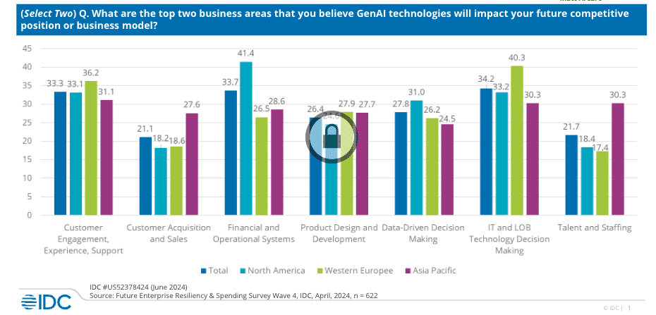 La GenAI marquera fortement trois domaines: la prise de décision technologique, les systèmes financiers et opérationnels ainsi que l’engagement et l’expérience client. Cependant, l’enquête révèle aussi que l’impact anticipé de l’IA varie significativement en fonction des différentes régions du monde. Alors que les acheteurs technologiques en Amérique du Nord voient les systèmes financiers et opérationnels comme le domaine le plus susceptible d’être influencé par la GenAI, ceux d’Europe occidentale estiment que la prise de décision technologique sera le plus affectée. En Asie-Pacifique, les répondants font état d’un impact anticipé important dans l’engagement et l’expérience client.