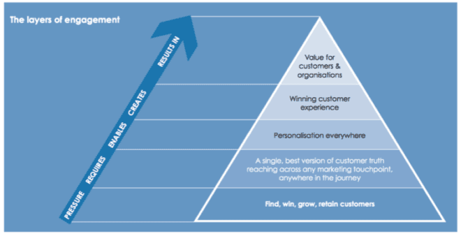 L’enquête indique aussi que les directeurs marketing doivent organiser leur service de sorte à engager les clients en leur proposant des expériences personnalisées à toute heure et partout où ils se trouvent. A ce titre, l’EIU accompagne ses conclusions d’un graphique intitulé « les différentes strates de l’engagement », qui fournit les best practices préconisées aux directeurs marketing et autres responsables marketing pour faire face à la concurrence en termes d’engagement client et apporter de la valeur à leur entreprise.