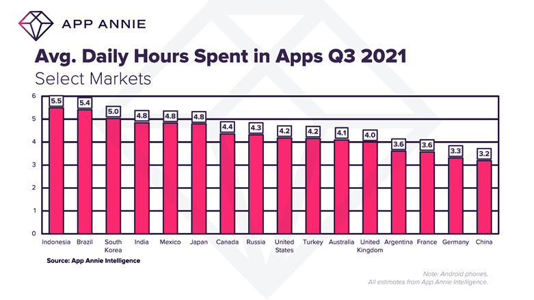 Un Français passe en moyenne 3,6 heures par jour sur les apps, alors que les Indonésiens ont atteint l’impressionnant chiffre de 5 heures et demi quotidiennes sur les apps au troisième trimestre 2021.