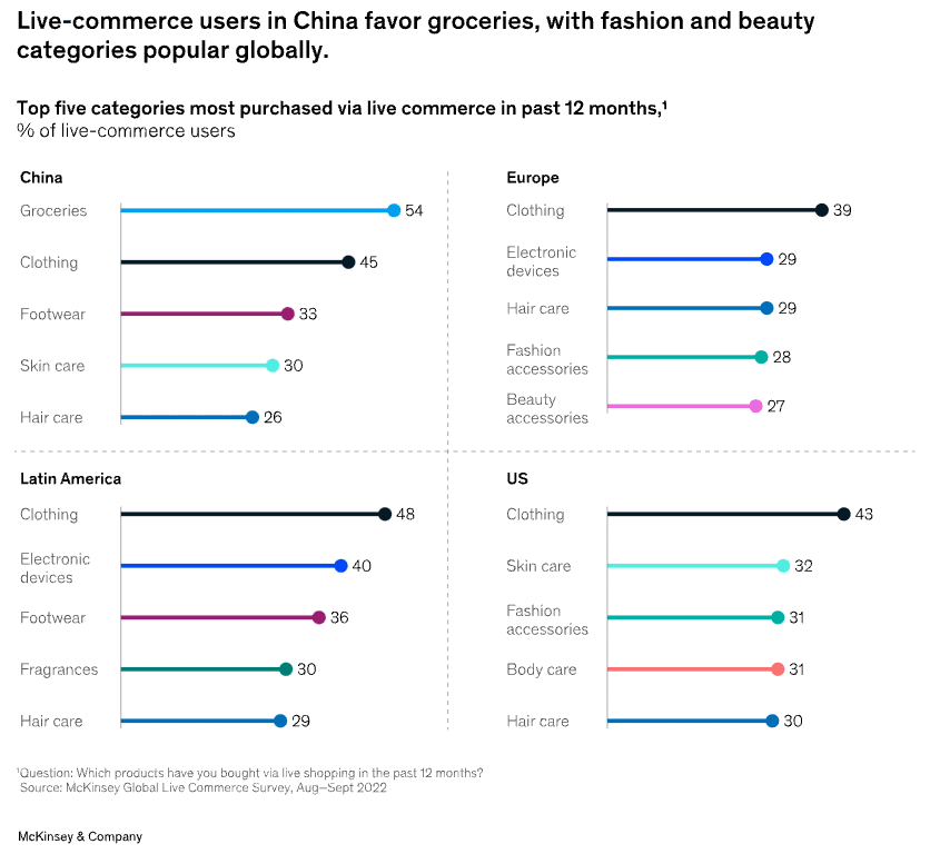 Pour les utilisateurs du commerce live interrogés en Chine, l’épicerie est la catégorie la plus achetée au cours des 12 derniers mois, tendance accélérée par la pandémie de COVID-19, au cours de laquelle les agriculteurs en direct sont devenus populaires. Les vêtements sont la catégorie de commerce live la plus populaire en Europe, aux États-Unis et en Amérique latine, tandis que les catégories les moins exploitées dans ces régions étaient des assurances (achetées par 9 à 11 % de tous les utilisateurs du commerce en direct au cours des 12 derniers mois) et des expériences telles que les voyages et les événements locaux (11 à 15 %). En Chine, seulement 11 à 13 % des utilisateurs du commerce live ont acheté de plus gros articles pour la maison tels que des meubles et de gros appareils électroménagers au cours des 12 derniers mois.