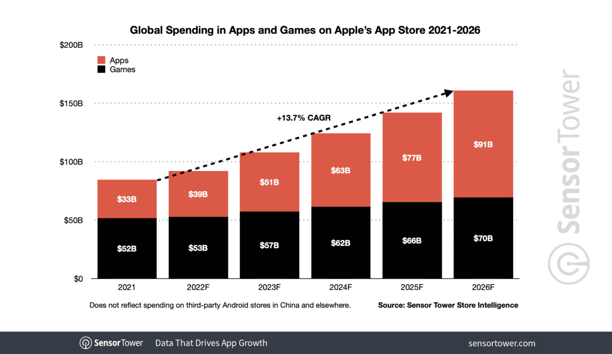L’App Store verra un TCAC de 13,7 % jusqu’en 2026 pour atteindre $ 161 milliards par an. Sur la plate-forme de Google, les dépenses de consommation devraient augmenter à un TCAC de 8,9 %, atteignant $ 72 milliards au cours des cinq prochaines années. Les États-Unis dépasseront la tendance mondiale dans tous les domaines, les dépenses de consommation devant atteindre $ 86 milliards en 2026 à un TCAC de 16,5. L’App Store d’Apple devrait connaître un TCAC de 18,8 %, atteignant $ 59,5 milliards, tandis que Google Play grimpera à $ 27,4 milliards à un TCAC de 12,3.