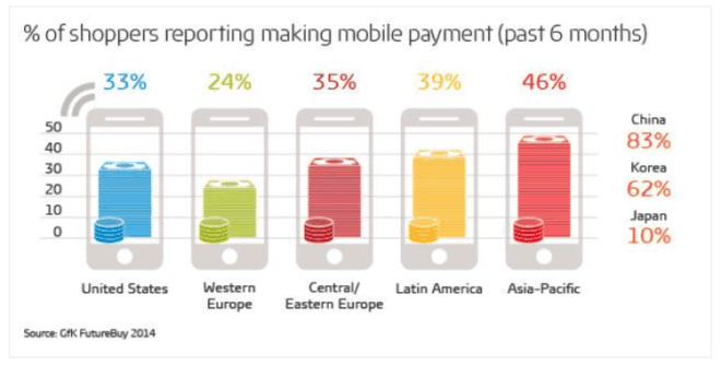 L’enquête de l’Institut GfK conduite dans 17 pays auprès de 17 000 consommateurs, révèle que seulement 5% des paiement mobile sont réellement effectuées avec un appareil mobile.