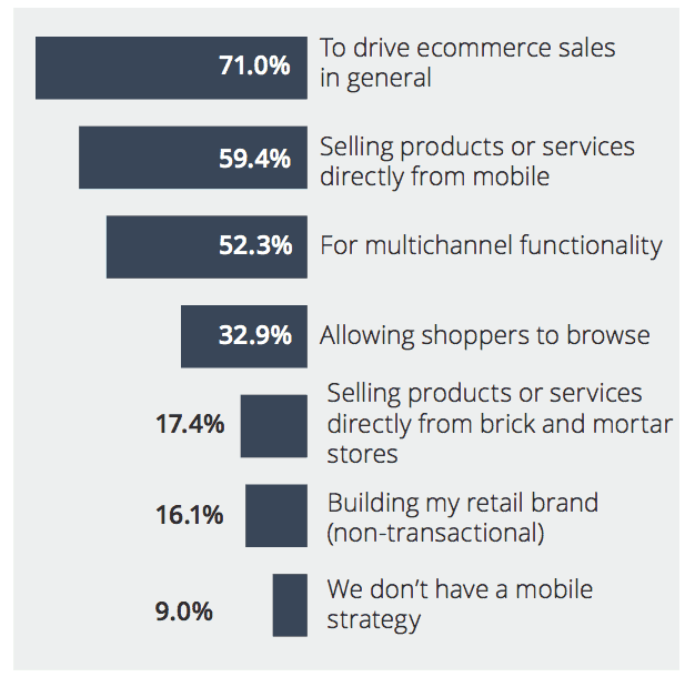 Un autre résultat clé de cette étude met en valeur l’importance grandissante du mobile. 87% des répondants prévoient d’augmenter leurs investissements dans ce secteur. Alors que la grande majorité (71%) espère pouvoir générer des ventes directement sur mobile, les dirigeants marketing sont néamoins conscients que la transaction finale est susceptible d’avoir lieu ailleurs (63%). Il est aussi intéressant à constater qu’en dépit de cet enthousiame pour le mobile, près d’1 marchand sur 10 (9%) n’a aucune stratégie mobile pour l’instant.