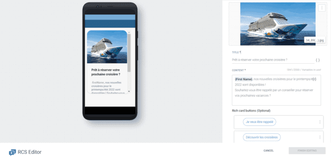 Le message RCS de type Carte permet d’afficher une image ainsi qu’un titre et un texte. Il est également