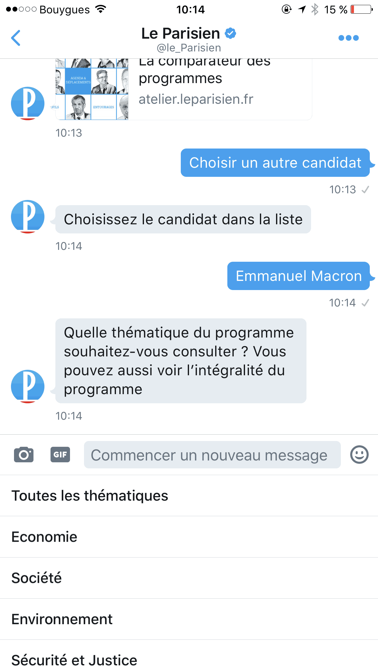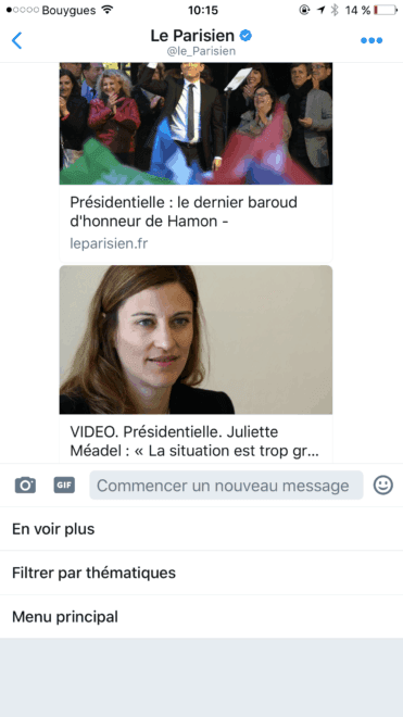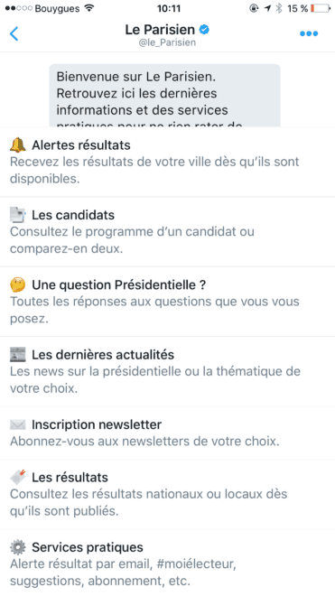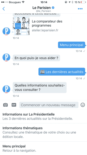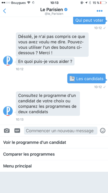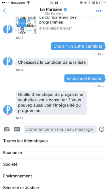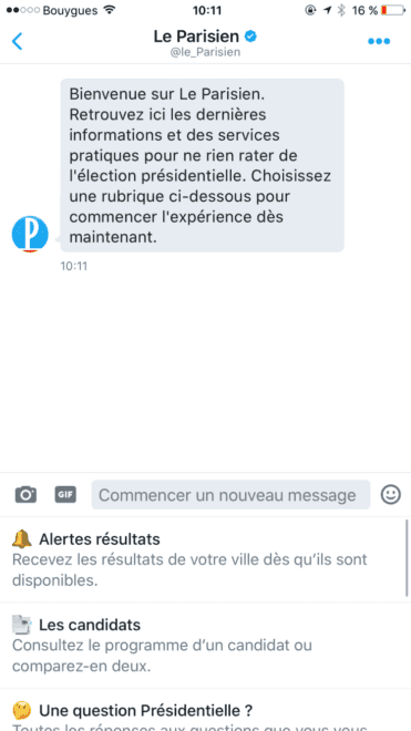 A l’occasion de l’élection présidentielle, Le Parisien met en place un robot conversationnel sur ses comptes Twitter Le Parisien (@le_Parisien) et Le Parisien Politique (@leParisien_pol). Fort d’une communauté de 2 millions de followers sur Twitter, Le Parisien est le premier média en France à lancer un service client par message privé sur Twitter.