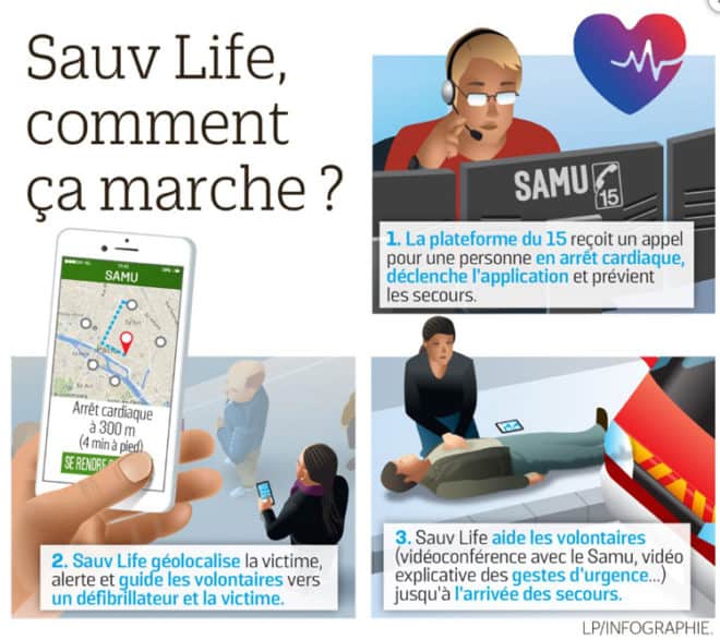 Cette application fonctionne sur le principe de la géolocalisation de citoyens qui sont volontaires pour aider les Samu. En pratique, vous allez installer votre application, accepter d’être géolocalisé (…) et en cas d’alerte au Samu, c’est-à-dire quelqu’un appelle pour un arrêt cardiaque, comme d’habitude les secours vont être déclenchés et, en parallèle, l’application va aussi être déclenchée. Les gens qui vont à être à 10 minutes à pied autour de cet arrêt cardiaque vont recevoir une notification et un sms pour demander s’ils sont disponibles pour aider. À ce moment-là, ils recevront par leur GPS la localisation où se passe l’évènement. Ils seront guidés pour aller sur place. Certains iront même chercher un défibrillateur qui est recensé dans l’application pour délivrer les premiers gestes de secours indispensables avant l’arrivée du Samu. Ils seront guidés à tout moment de cette opération. Source et suite ICI