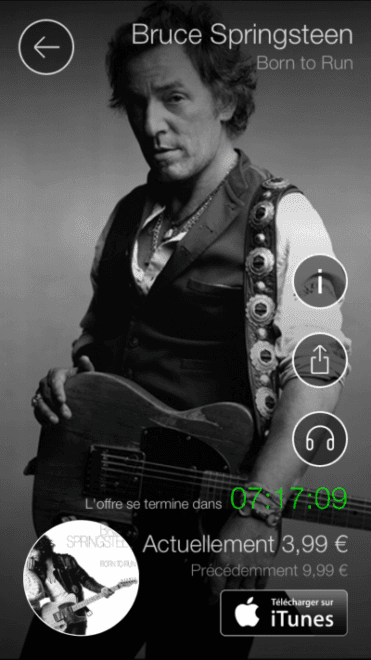 Disponible sur l’Apple Store à partir du 21 octobre 2014, l’application Album du Jour sera d’une utilisation ultra simple. Une fois que vous l’avez installée, vous recevez tous les jours une offre sur un album avec un compte à rebours qui vous informe du temps qu’il reste pour l’acheter à prix promo. Si l’album vous plait, il suffit de cliquer pour être dirigé vers iTunes et bénéficier du prix annoncé. Les chansons sont ensuite intégrées à votre bibliothèque musicale et écoutables autant que vous le souhaitez sur n’importe lequel des appareils iOS rattachés à votre compte. Quelques clics et votre discothèque s’agrandit à petit prix.